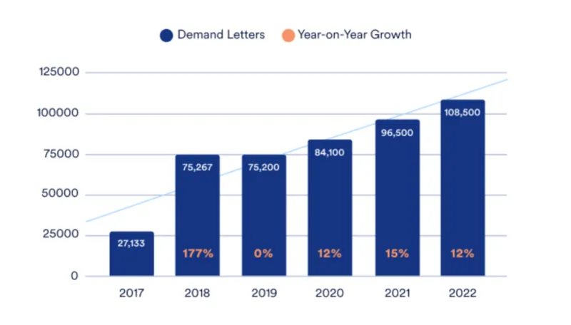 In 2022, 3,250 lawsuits were filed, representing only 3% of demand letters, as 97% are settled before going to trial, which means the number of demand letters is even much higher.